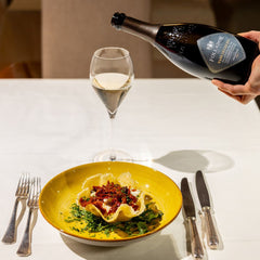 A esaltare la dolcezza del salmone marinato e le note terrose della barbabietola, troviamo il Cru Torri di Credazzo Extra Dry di Follador — un abbinamento naturale. Il suo bouquet floreale, il perlage fine e le eleganti note agrumate esaltano la freschezza del piatto, prolungando nel palato la delicatezza dei sapori. Un sorso rivela sfumature di fiori bianchi e agrumi, in perfetta armonia con la vivacità della tartare.